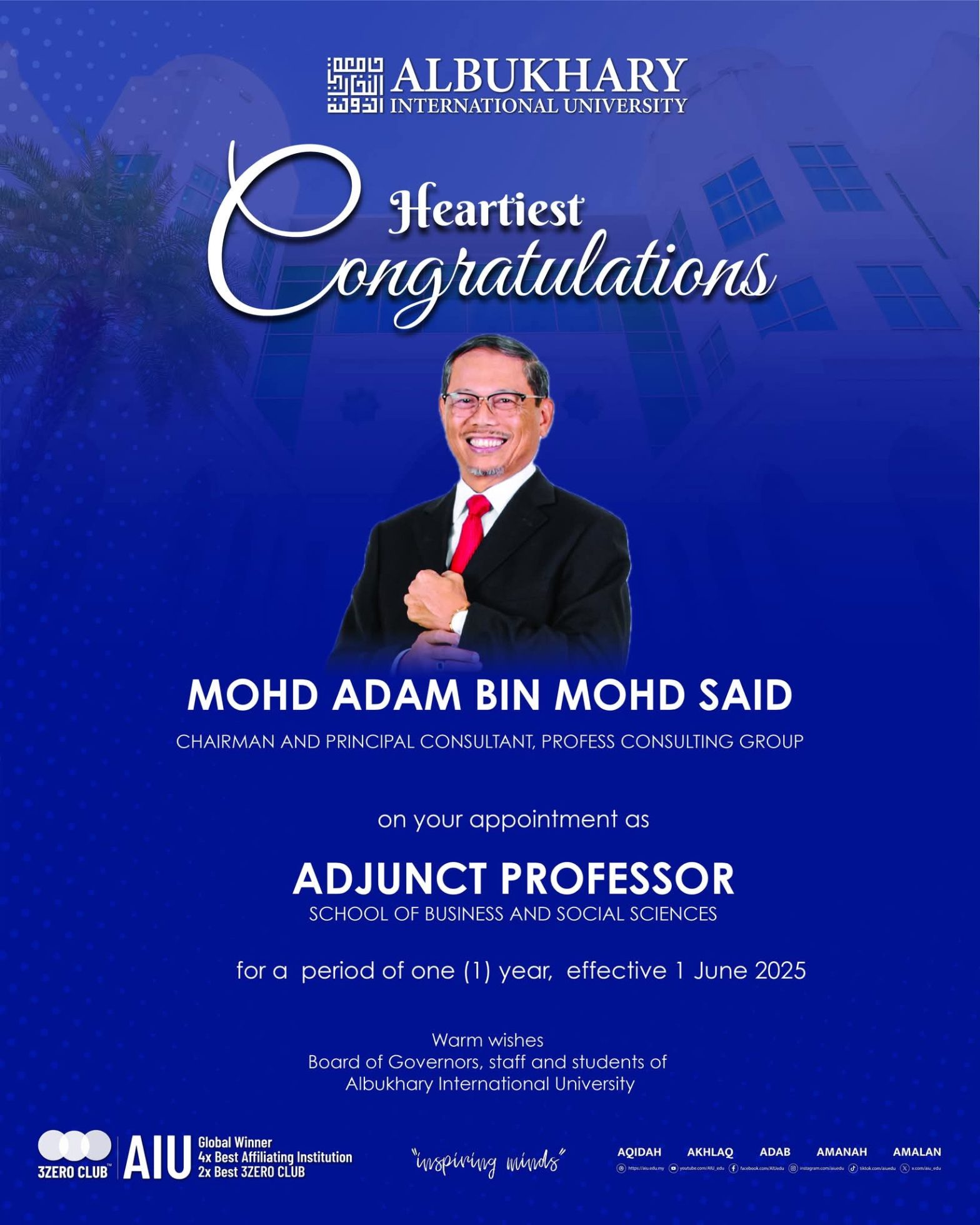Proud Announcement Multimedia Consulting Sdn Bhd (MMCSB) is delighted to share that our Executive Director, En. Mohd Adam Bin Mohd Said, has been appointed as Adjunct Professor at the School of Business and Social Sciences, Albukhary International University (AIU).   This appointment is effective 1 June 2025 for a period of one (1) year.  … Continue reading Appointment of Adjunct Professor: Prof. Mohd Adam Bin Mohd Said